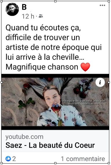 D’ailleurs, en guise de bonne foi de ma part, il y a ce tout dernier article en date. Celui simplement nommé: Culture musicale. J’y confie ma propre tendresse envers un certain chanteur (mon « Saez » à moi, mon Alter-Damien, « mon » Aurélien). Celui que j’ai du laisser un peu de côté (juste un peu) pour ne pas me faire happer par ses propres démons…