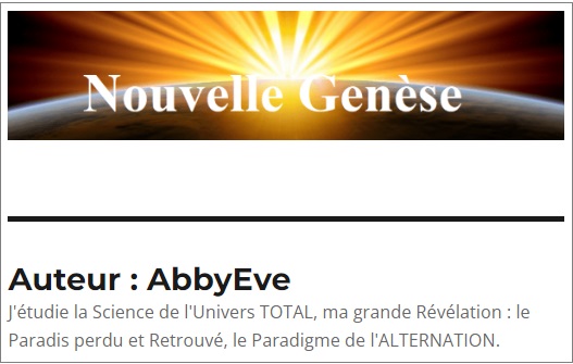 « Merci pour l’information. Donc, si quelqu’un souhaite explorer les écrits d’Abby Eve sur la Science de l’Univers TOTAL, ils peuvent visiter l’adresse suivante : https://nouvellegenese.wordpress.com/. »